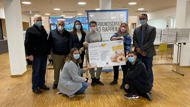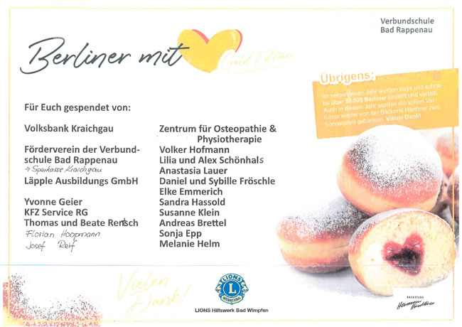 Pünktlich zu Beginn der Faschingssaison am 11.11.lieferten Herr Hans-Carl von Schönberg-Pötting und Herr Georg Siepmann vom Lions Hilfswerk Bad Wimpfen zwei Autoladungen voll frischer Berliner an die VBS. Schon beim Entladen der über 40 Stiegen half die ganze Schulgemeinschaft mit: Vom Elternbeirat Elke Emmerich und Anastasia Lauer, die Schülersprecher Philipp Ibrahim und Fabienne Schwarz, Rektorin Yvonne Geier und Konrektor Josef Reif. Alle an der Schule bekamen an diesem Tag mindestens einen „Süße-Helfer-Berliner“ als kostenlose Überraschung, der benachteiligte Kinder der Region je mit 50 Cent unterstützt. Die Berliner wurden von Unterstützern der Verbundschule gespendet. „Juhu!“, „endlich“, wurden die Schülersprecher begrüßt, als sie, natürlich mit Mundschutz und Handschuhen, die Gaben in die Klassenzimmer brachten. Herzlichen Dank an die Spender!