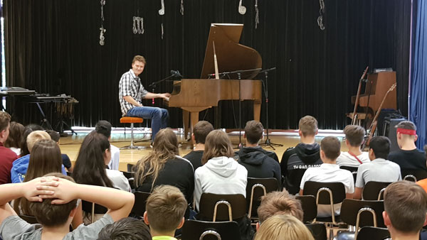 Am vergangenen Donnerstag bot sich interessierten Schülernnen in der Aula der Verbundschule Bad Rappenau ein außergewöhnliches musikalisches Erlebnis. Der Pianist Dan Popek aus Wollenberg gab in insgesamt drei 20-minütigen Konzerten einen Ausschnitt seiner virtuosen, unterhaltsamen und teils akrobatischen Darbietungen am Flügel zum Besten.