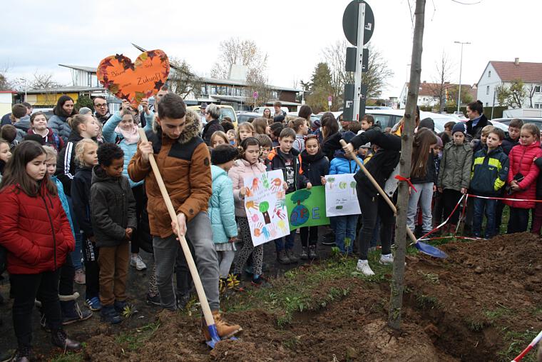 Über 150 Kinder haben sich vor der Albert-Schweitzer-Schule versammelt. Einige halten selbstgebastelte Schilder in die Höhe. "Bäume sind unsere Zukunft" oder "Grün statt Beton" ist darauf zu lesen. Die Schüler gehen auf keine Klima-Demo, sondern wollen rund um die Schule Bäume pflanzen. Die gemeinsame Aktion der Bad Rappenauer Schulen, des Nabu und der Stadt Bad Rappenau geht auf die Initiative von Dr. Friedrich Dorschner zurück. Der Mediziner engagiert sich seit Jahren beim Nabu. "Ich habe ungefähr einen Hektar Laubmischwald in meinem Leben gepflanzt", erzählt Dorschner.