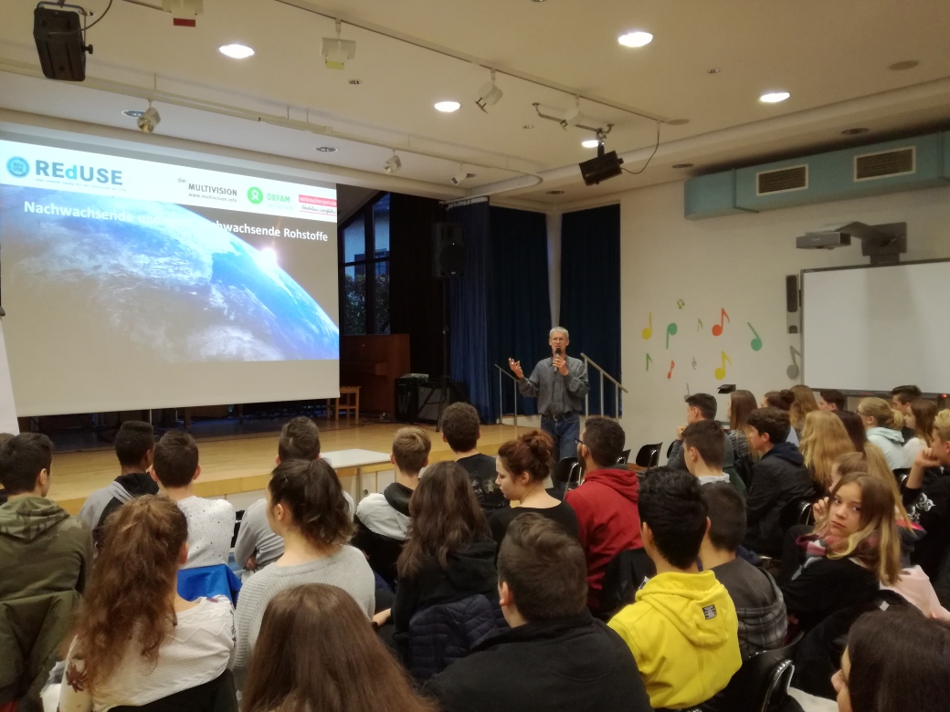 Unsicherheiten darüber kann Herr Simonis schnell zerstreuen, denn durch einfache Fragen an das Publikum deckt er eines auf: Wir alle sind tagtäglich Konsumenten – mehr oder weniger bewusst. Wir benutzen Wasser, sei es als Getränk oder zum Waschen. Unser Frühstück in Form von Brot oder Müsli besteht aus Getreide und den Weg zur Schule legen die Wenigsten zu Fuß oder mit dem Fahrrad zurück. Der Großteil von uns fährt mit dem Auto oder Bus zur Schule. Diese beiden Fortbewegungsmittel bedürfen wiederum einer Ressource, nämlich Erdöl.