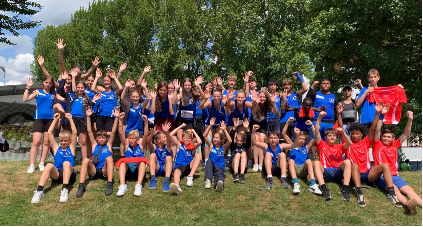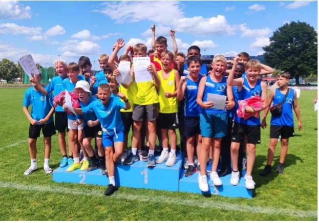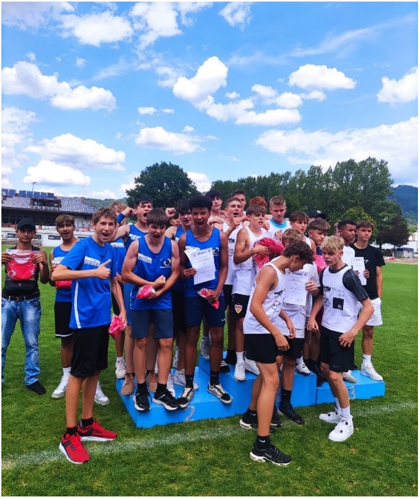 Dieses Landesfinale fand am 13. Juli 2023 in Oberkirch statt. Bereits um 7.15 Uhr machten sich die 40 Schüler:innen, begleitet von fünf Lehrkräften, mit dem Bus auf den Weg. Mit der hochklassigen Konkurrenz aus dem ganzen Ländle wurden zu “Eye of the tiger” ins Stadion eingelaufen und so startete man motiviert in die Wettkämpfe. An der Bande wurde lautstark angefeuert und die Stimmung war phänomenal. In dieser Atmosphäre konnten einige der Verbundschüler:innen ihre Leistungen aus dem Kreisfinale noch verbessern: Angelina Waldorf (GMS 8a) sprintete die 75m in 11,45 Sekunden, Annika Merkle sprang 4,37 Meter. Marlene Hassold und Johanna Beinroth (beide RS 7b) warfen beide über 30 Meter. Julien Rupp (RS 5a) und Munir Kidjera sprangen mit 4,16m und 4,15 nahezu gleich weit. Einen galaktischen Wurf von sage und schreibe 70 Meter gelang Elias Osayuwu. Man munkelt, er habe dabei fünf Döner aufgrund interner Wetten gewonnen. Filip Terzic verbesserte seine starke 800m-Zeit aus dem Kreisfinale um unglaubliche 10 Sekunden auf 2:17 Minuten. Beide Leistungen: NEUER VERBUNDSCHULREKORD! Nochmal richtig Punkte für ihr Team sammelten die beiden ersten Staffeln der Jungsteams, die mit 28,67 Sekunden (4x50m) und 38,13 Sekunden (4x75m) durch perfekte Wechseln ihre Läufe gewannen.