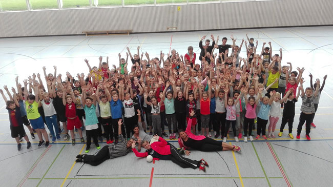 In den ersten beiden Stunden spielten die Zweitklässler in Teams gegeneinander. Die Spiele wurden von den Fans der jeweiligen Mannschaften lautstark von der Tribüne unterstützt. Bei sehr fairen, aber auch spannenden und knappen Spielen, haben die beiden Mannschaften der 2c „Die Schlümpfe“ und „Die Gummibärchenbande“ den 1. Platz belegt. Die vier Mannschaften der Klassen 2 a und 2 b belegten gemeinsam einen hervorragenden 2. Platz.
