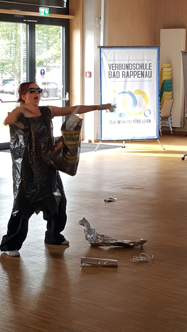 In zwei weiteren Kurzdarbietungen erfuhren, die Schülerinnen und Schüler mehr über die Mengen und die Verbreitung von Müll, die wir Menschen produzieren. Erstaunlich war für dieSchülerinnen und Schüler aus wie vielen Rohstoffen und Einzelteilen unsere Handys bestehen. Dass in Summe ein gewöhnliches Handy schnell 90 000 Kilometer Transportweg zurücklegt schätzten die wenigsten. Und dass Handys bei uns anschließend im Durchschnitt nur rund 1-2 Jahre genutzt werden, konnten ebenfalls viele Schülerinnen nicht nachvollziehen.
