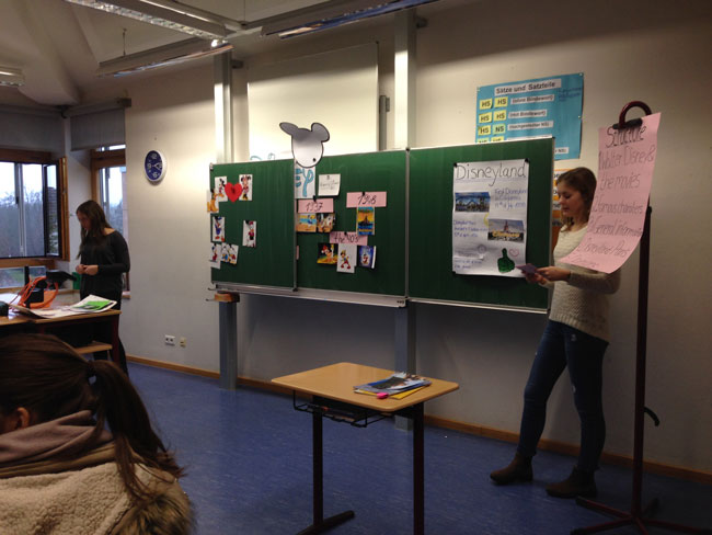 „Im Geist der Dankbarkeit“ antwortet Mika aus der R9b auf die Frage nach der Bedeutung des Ausdrucks „with the sense of appreciation“ in der Einladung zum zweiten EUROKOM Presentation Day in Bad Rappenau. „Nicht ganz aber sehr nahe“ wird Mika lobend korrigiert; es heißt wörtlich „mit dem Geist der Wertschätzung“ mit welchem die Schülerinnen und Schüler der 9. Klassen einen Präsentationszyklus ihrer Mitschüler der 10. Klassen durchlaufen werden. Die Präsentationen sind das englischsprachige Herz- und Kernstück der mündlichen Realschulprüfung im Fach Englisch, genannt EUROKOM, die ergänzt werden durch einen Hörverstehenstest (Listening Comprehension) und eine Kommunikationsaufgabe (Role Play). Beide Aufgabenstellungen erleben die Realschüler, die im November 2016 ihre EUROKOM Prüfung absolvieren werden, an Live-Beispielen : Die an der Realschule unterrichtenden Lehrerinnen Gerda Philipps und Annemarie Jung demonstrieren diese Prüfungsaufgaben auf der Bühne der Schulaula mit den Schülerinnen Amelie Maurer, Sydney Borth, Laura Vorwerg und Franziska Hauck.